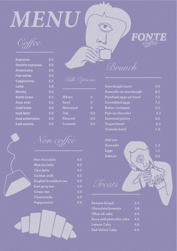 FONTE positions itself as a place for good coffee without pretension. The tone of voice is light and contemporary, reflecting a modern audience that values quality, atmosphere, and design as part of the coffee experience.